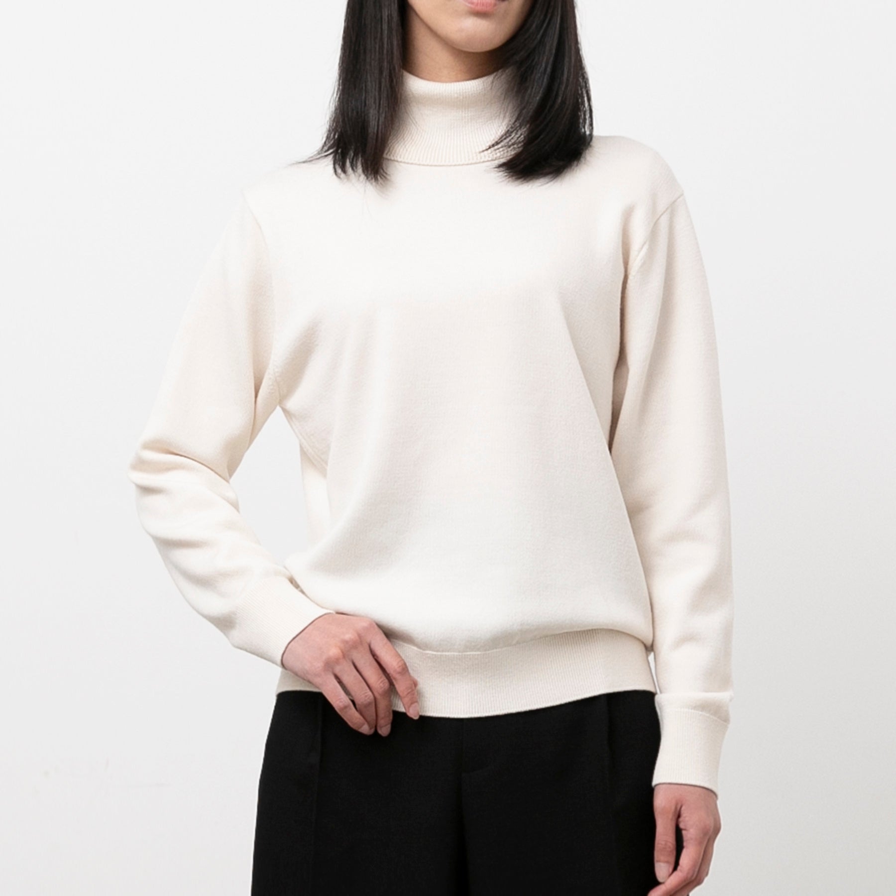 ウール特有のチクチク感を解消する特殊な表面加工を程しているため、肌に触れる部分が多いタートルネックも心地よく着用できます。