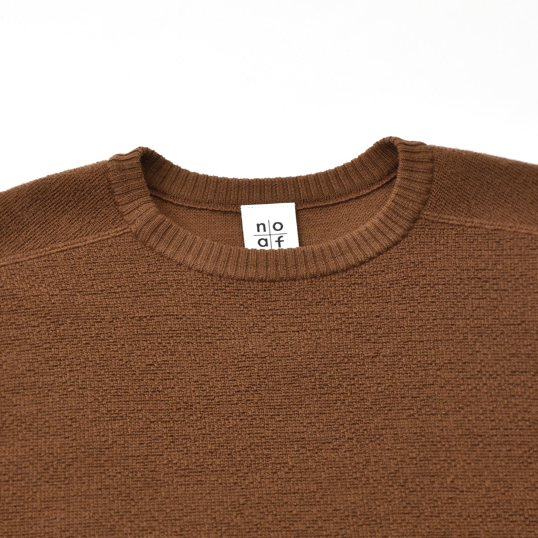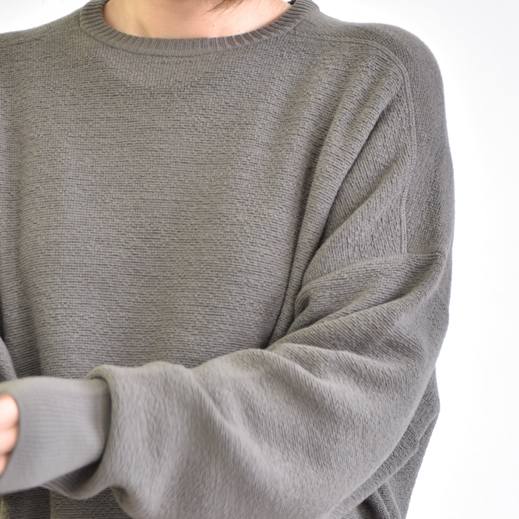 両面組織を変形させた編み地は、ブークレのような立体的な表情をもつオリジナルのワッフル柄に仕上げています。