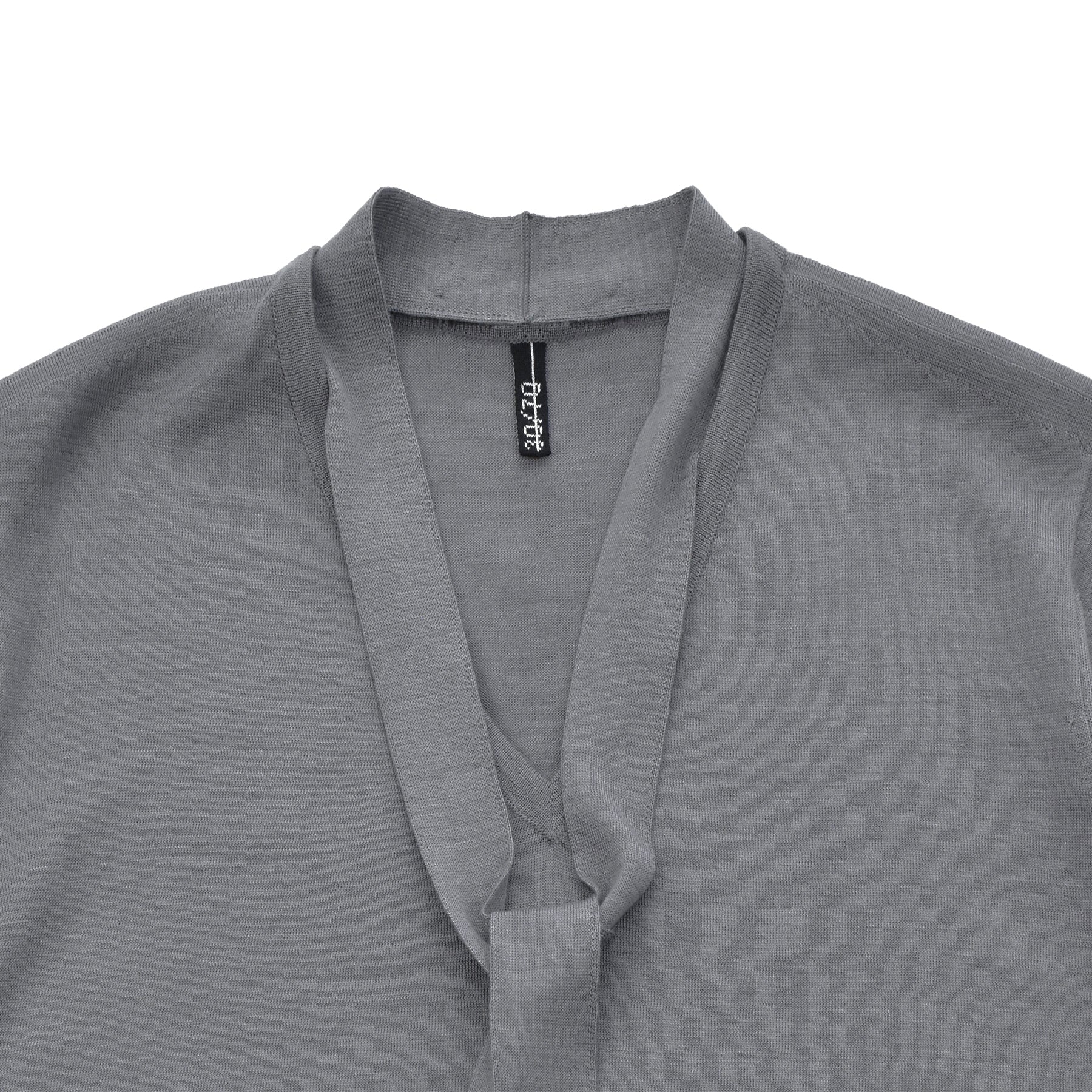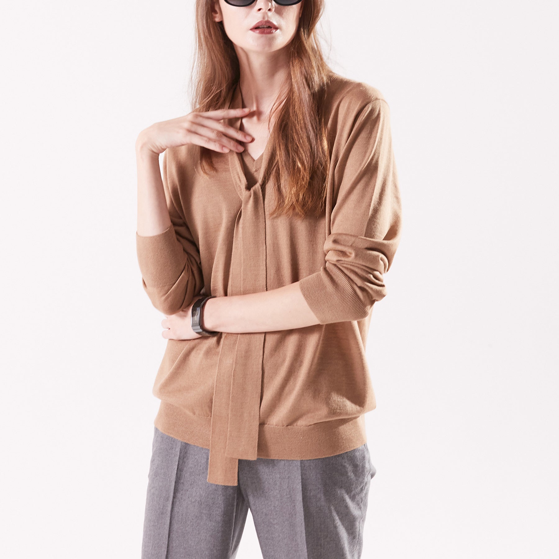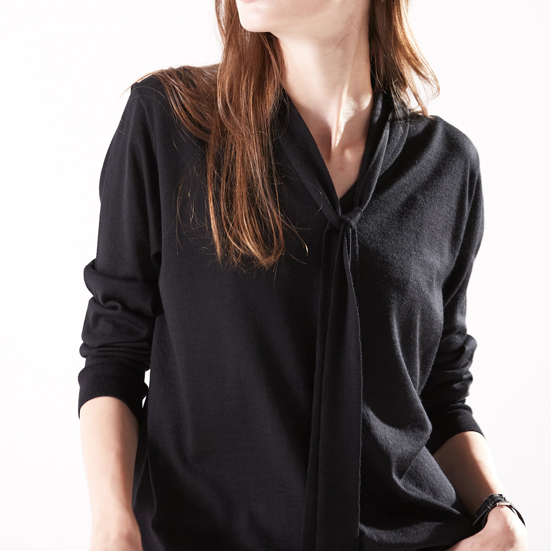 取り外し可能なボウタイ使いで2通りの表情を楽しめるVネックプルオーバー。少し深めのV開きはデコルテラインを綺麗にシャープに引き締め女性らしさが覗くデザイン。ここにタイをつける事で心地良い緊張感が生まれ1枚でも存在感のあるアイテムに。通常縫製で繋ぎ合わせる肩線はニット特有のリンキング仕立てで段差をなくしたフラット仕様。またネックのV先は斜めに編むことで余計な厚みをなくし軽やかに仕立てました。