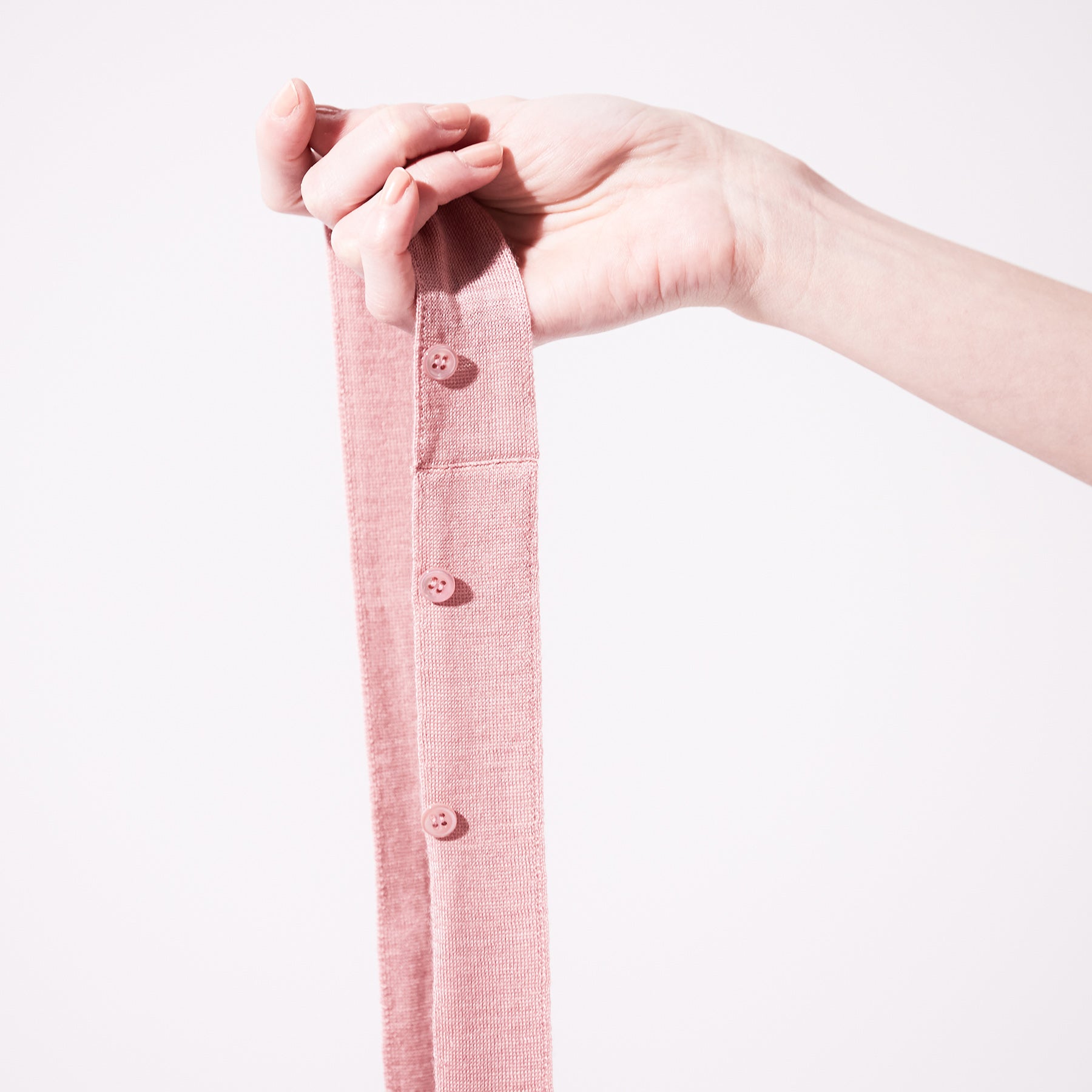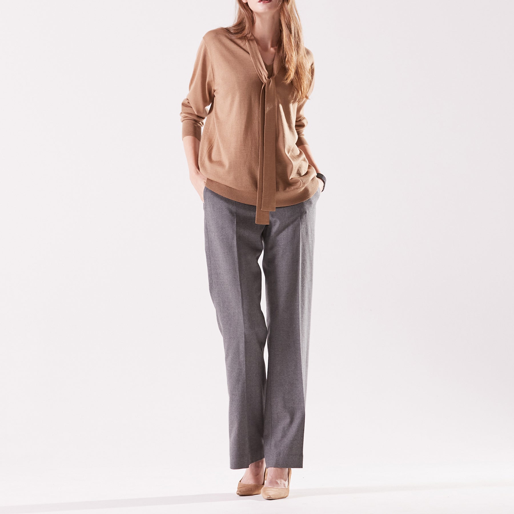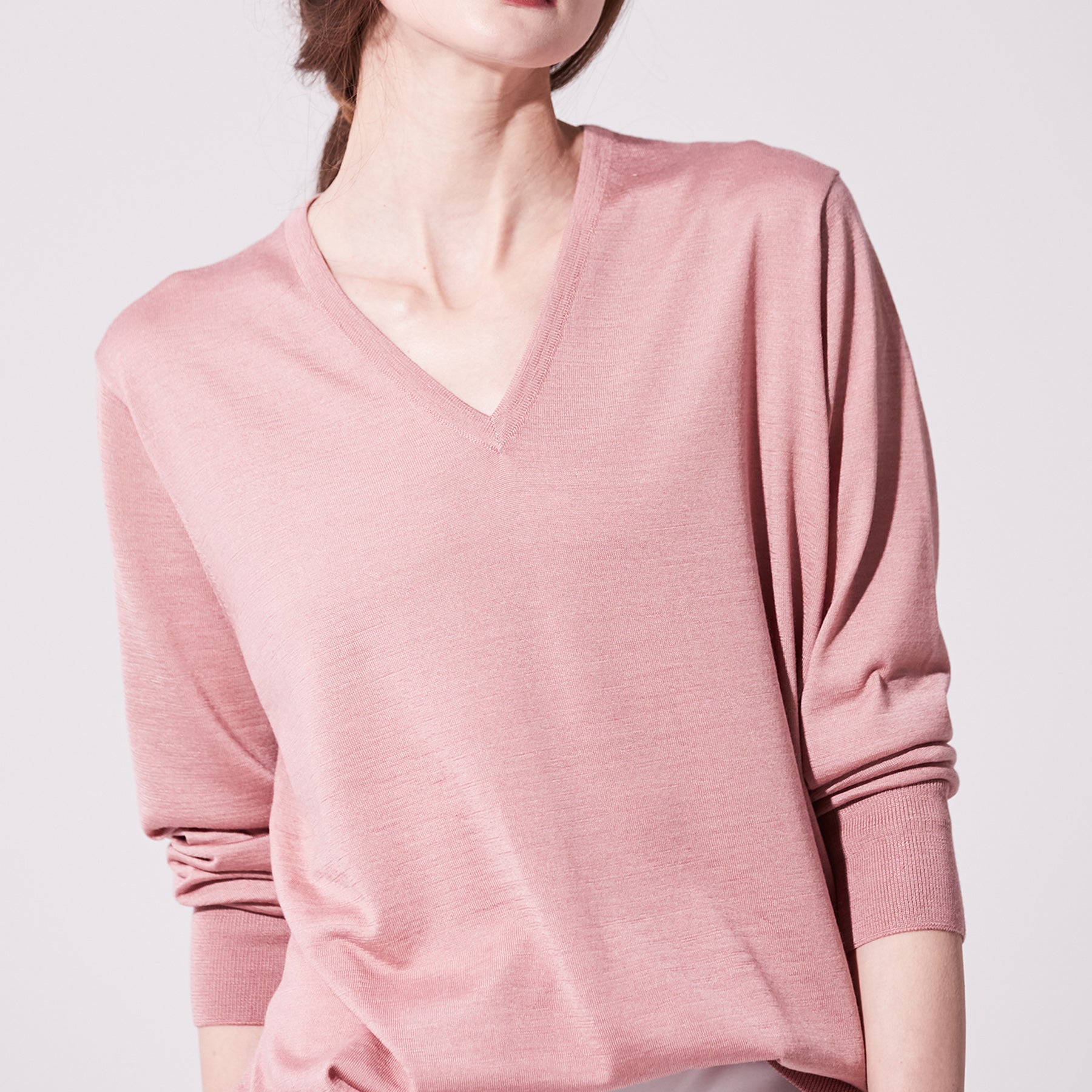 取り外し可能なボウタイ使いで2通りの表情を楽しめるVネックプルオーバー。少し深めのV開きはデコルテラインを綺麗にシャープに引き締め女性らしさが覗くデザイン。ここにタイをつける事で心地良い緊張感が生まれ1枚でも存在感のあるアイテムに。通常縫製で繋ぎ合わせる肩線はニット特有のリンキング仕立てで段差をなくしたフラット仕様。またネックのV先は斜めに編むことで余計な厚みをなくし軽やかに仕立てました。