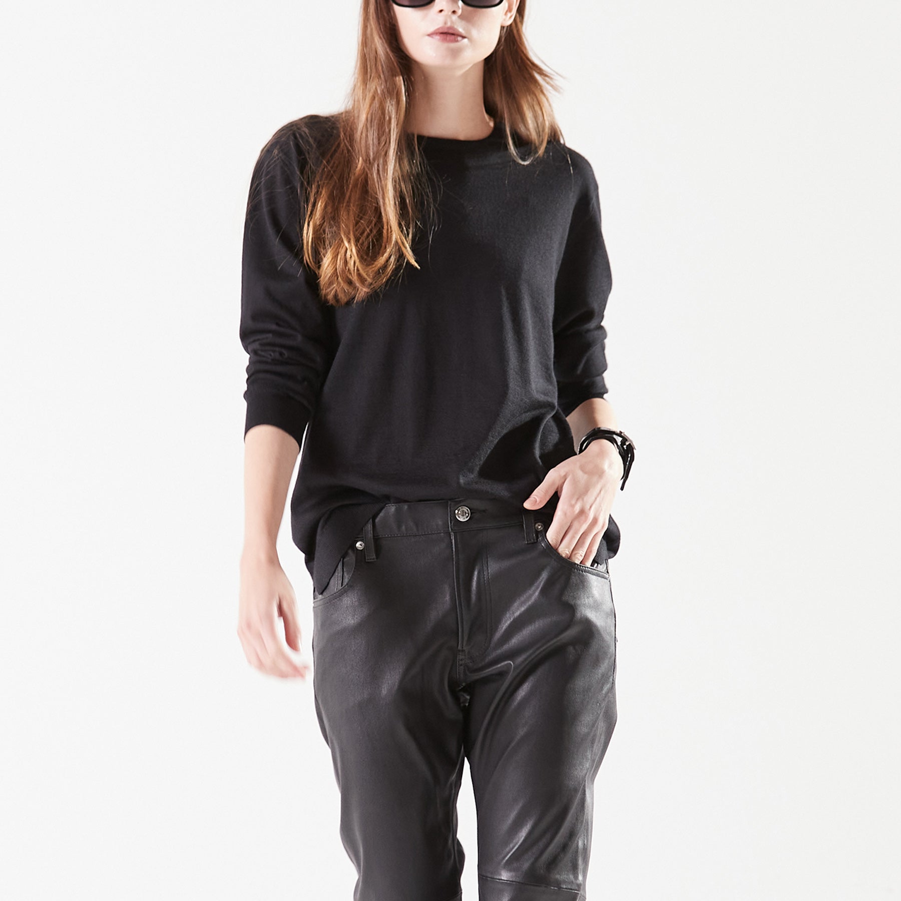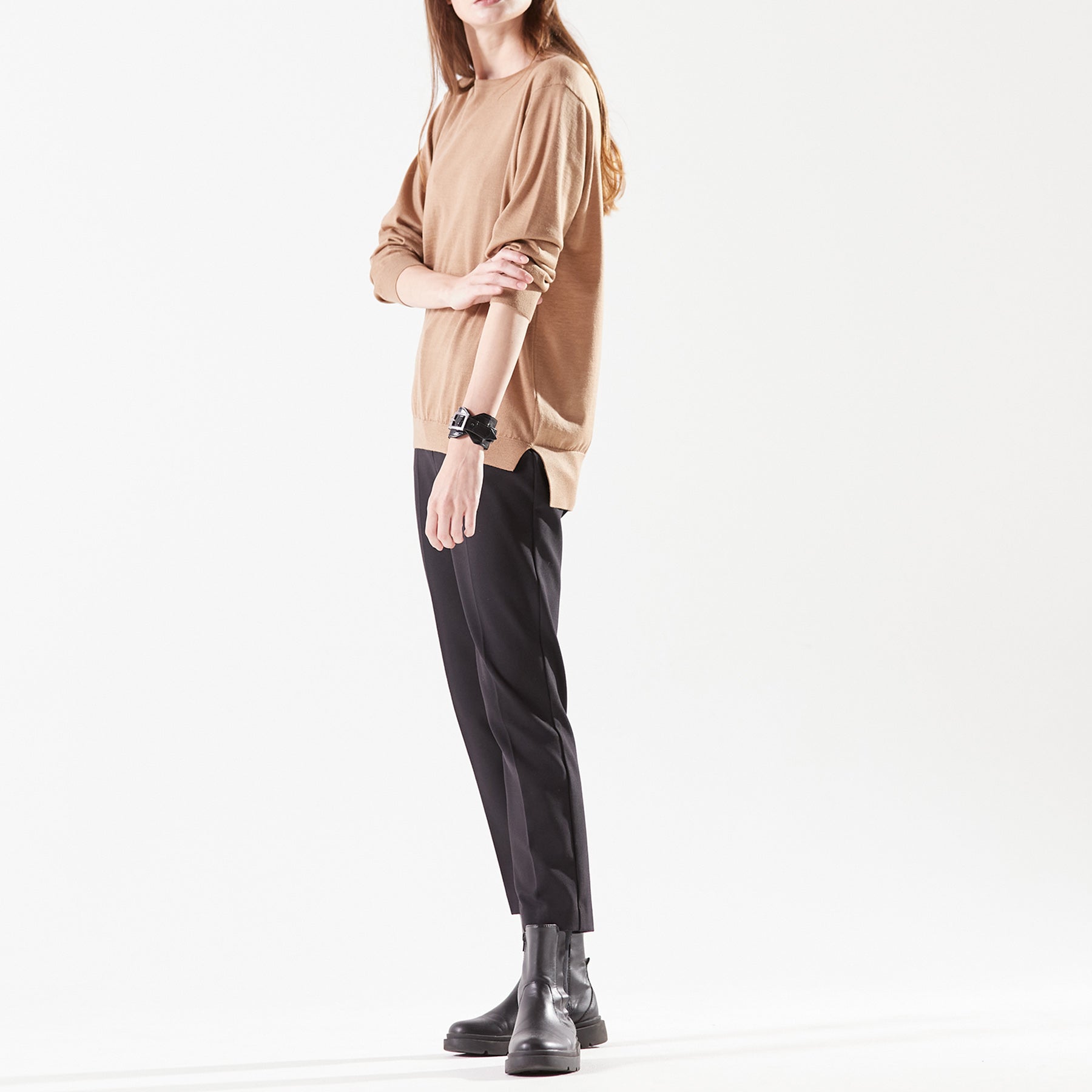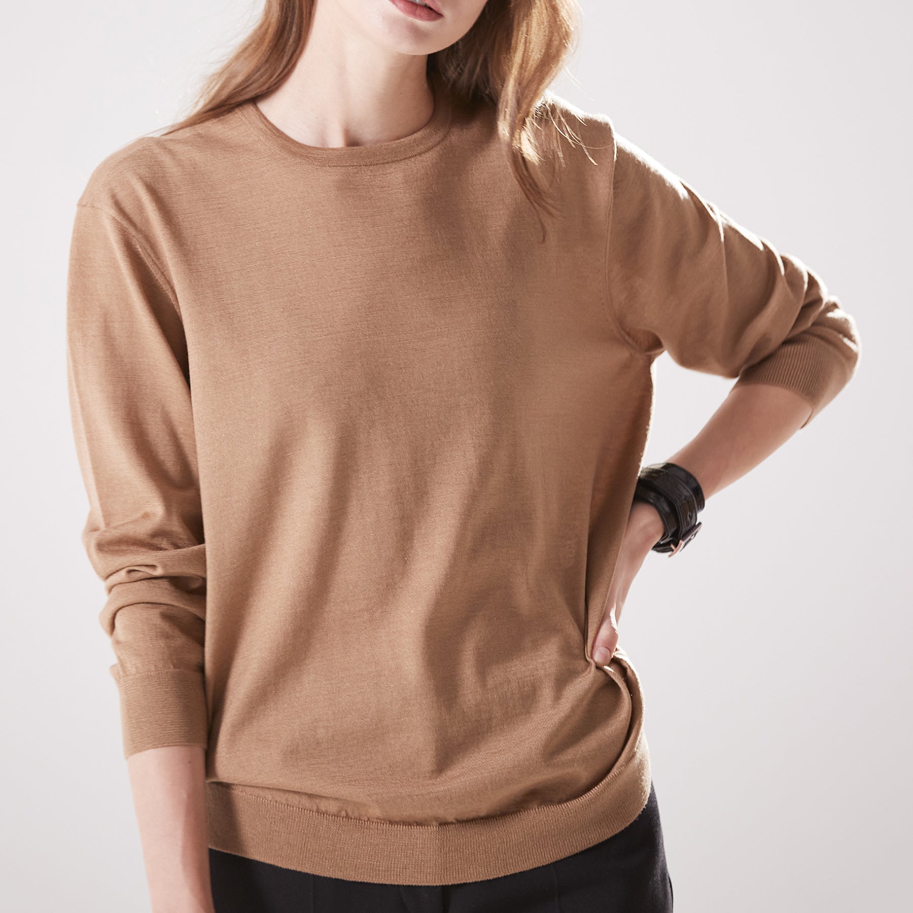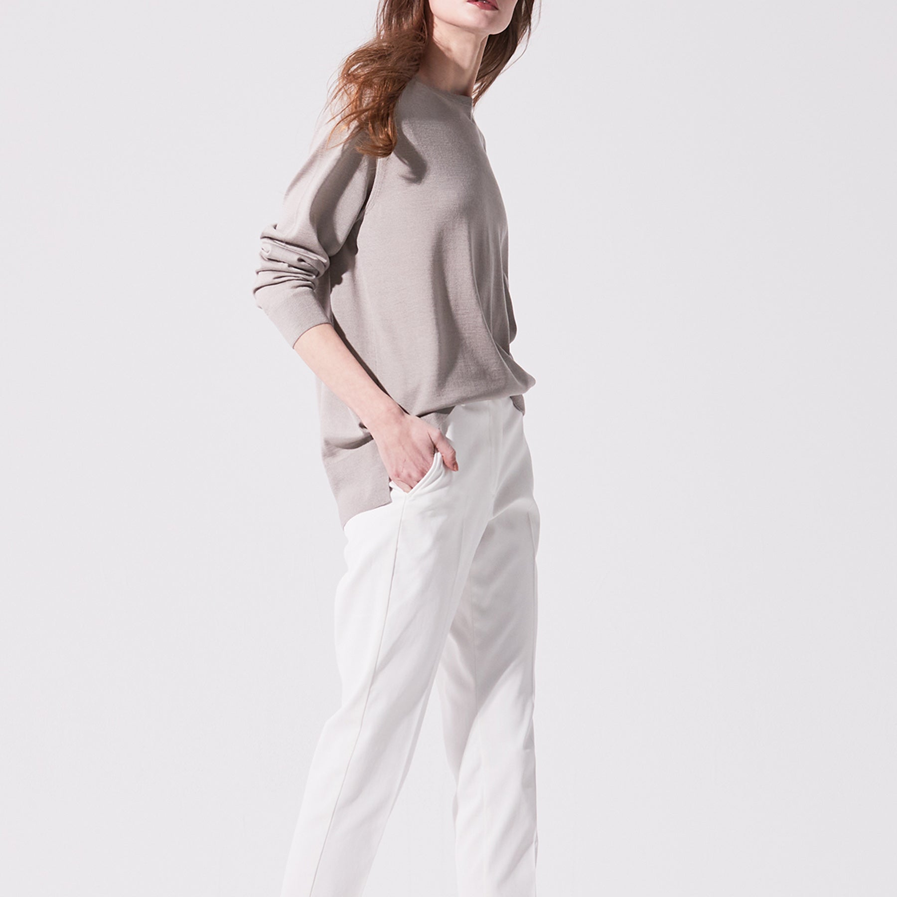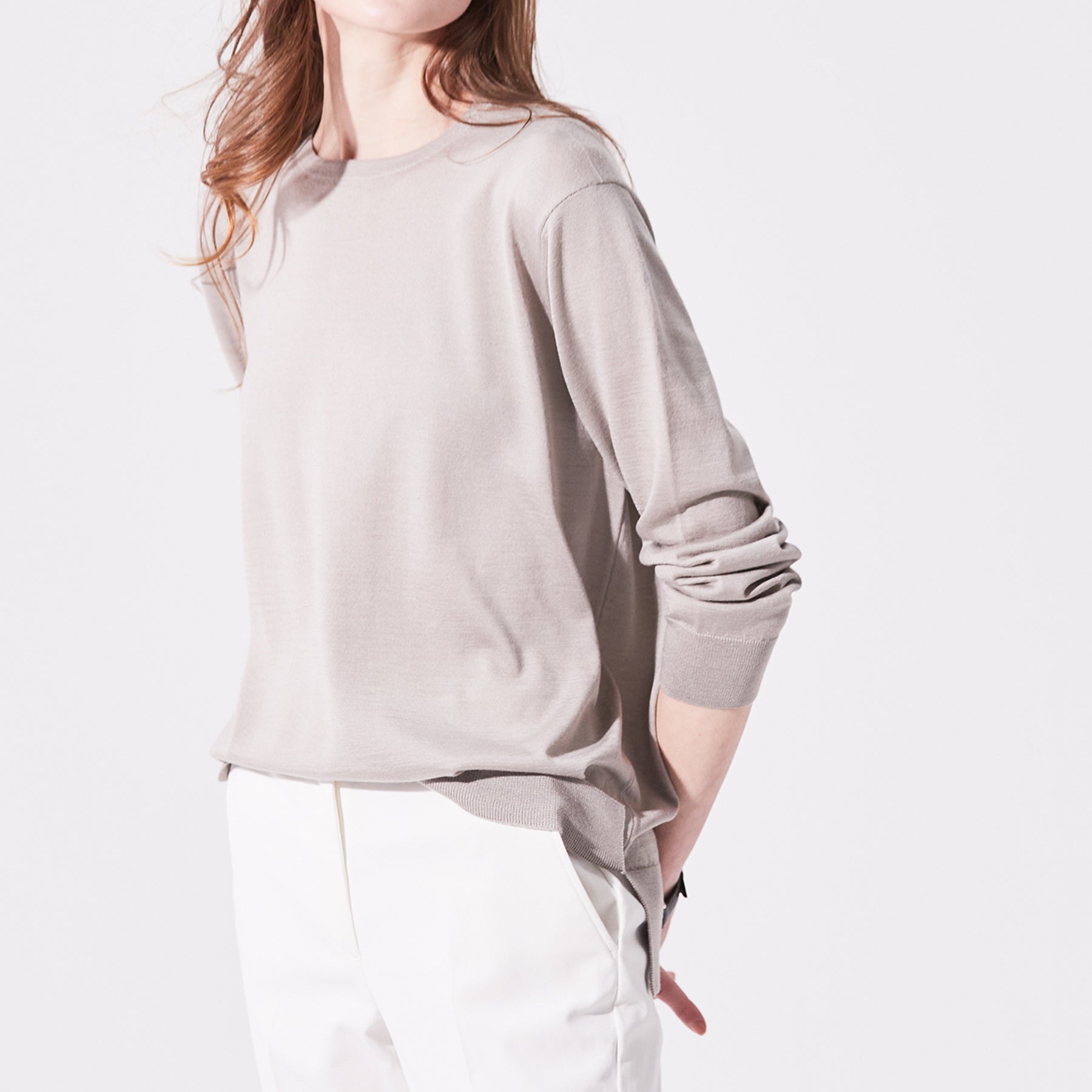 心地良い緩みのあるサイジングに、コンパクトなネックラインが印象的なプルオーバー。深さを抑え、少しスクエア型にかたどったネックラインは存在感がありながら首元を品良くシャープに見せてくれます。裾にはサイドスリットがあり前身より後身が長く設定されているので裾の見せ方も自由にアレンジが可能。肩線はニット特有のリンキング仕立てで段差をなくしたフラット仕様。素材の優しいニュアンスに合わせ肩まわりも丸みを出し柔らかさを表現しました。“上質な素材をナチュラルに着こなす”大人のゆとりを感じるニュアンスニットです。
